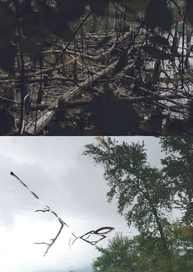 Une écluse sépare le lac du bois de la Bâtie de l’Isère, métal et béton faisant barrage entre la rivière en mouvement et le lac pacifique où vivent les castors, réintroduits et protégés depuis 1990. A travers la photographie, il s'agit traduire l'action de barrer un passage, de faire obstacle à la vue, ceci à partir de la seule observation de l'environnement du lac et de son périmètre proche. A travers des retournements, haut/bas, dessus/dessous, la vue est perturbée. La photographie est en deux temps, soit en oppositions, soit dans des liens de formes/couleur. Souvent opposant verticalité et horizontalité, nature et construction, dégagement et dissimulation. A travers une discussion, je découvre qu'il est fréquent de croiser des tortues - à l'origine domestiquées puis relâchée en milieu naturel à cause de leur grande taille – que le personnel de l'Espace Naturel Sensible s’efforce de réguler pour ne pas nuire à l'écosystème naturel à coup de carabine. C'est ce que j'ai pu observer dans la zone de l'écluse, découvrant deux cartouches et présence de sang. Je n'interviens pas sur l'environnement pour la prise de vue, je me contente de collecter ce que j'y trouve.